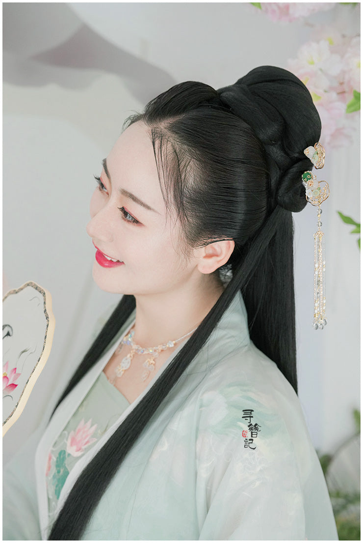 In traditional Hanfu culture, the hairstyle and the accompanying accessories are considered important elements that complete the overall look and reflect the wearer's social status, fashion sense, and personal style.