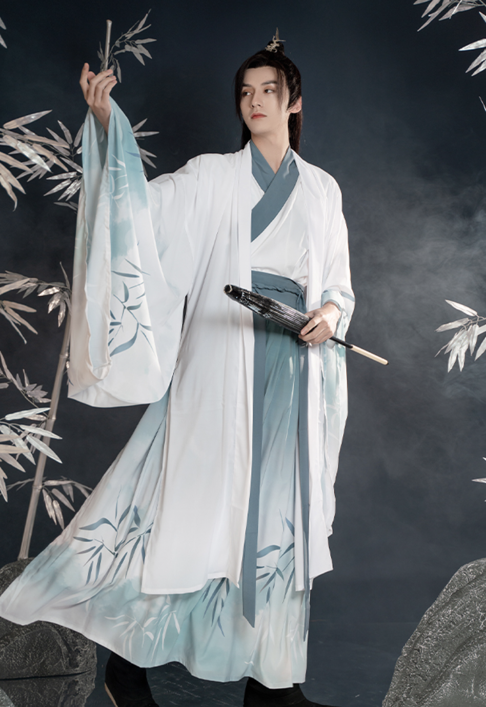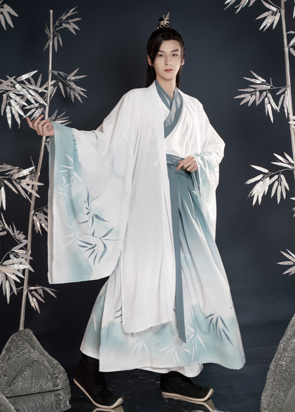 The 'Bamboo Rhyme' hanfu for men features a serene gradient of white to turquoise grey. Printed with delicate bamboo leaves, it evokes the gentle rustling of a bamboo grove in the wind. The subtle blend of light and shadow on the fabric, devoid of embroidery, highlights the natural elegance and tranquility of the design.