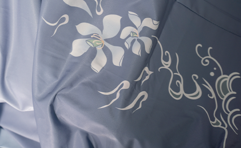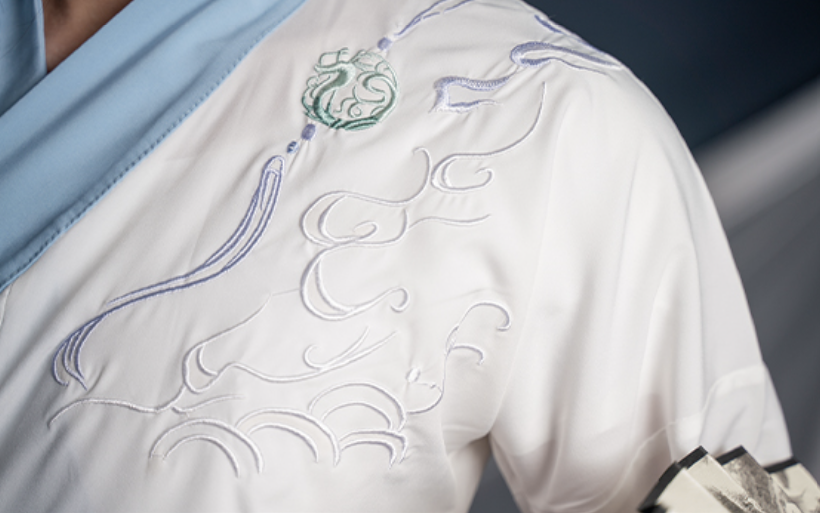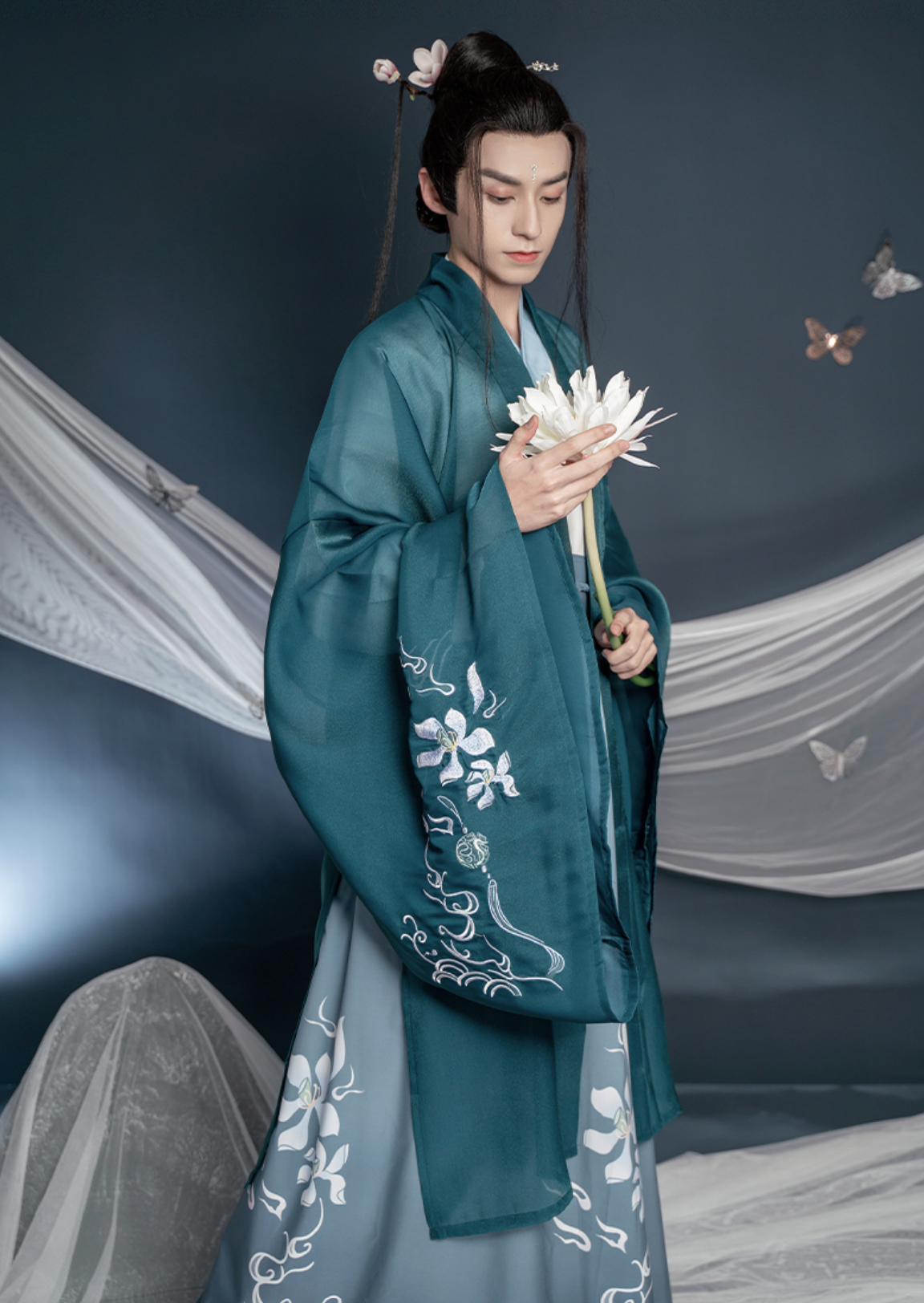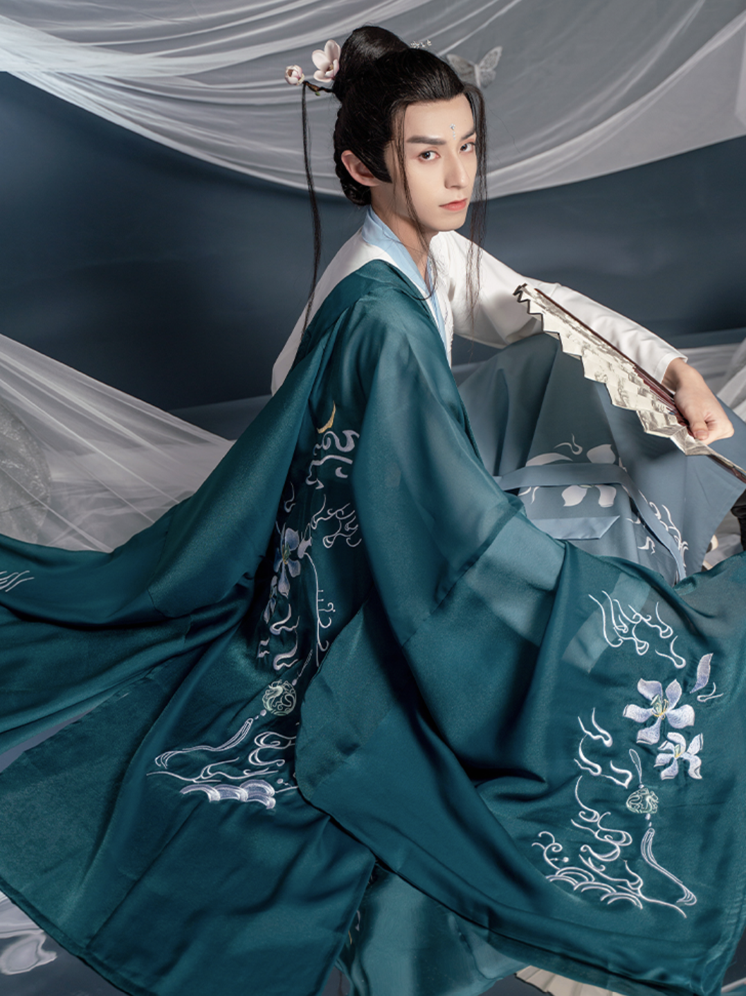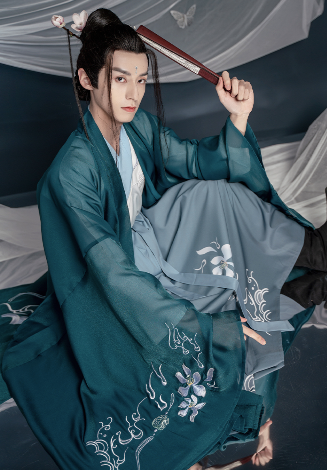 The 'Carefree' hanfu for men comes in shades of blue and turquoise. It features a mix of embroidered and printed flowers, creating a rich, textured look. Delicate blossoms are meticulously embroidered, while printed floral motifs enhance the design.