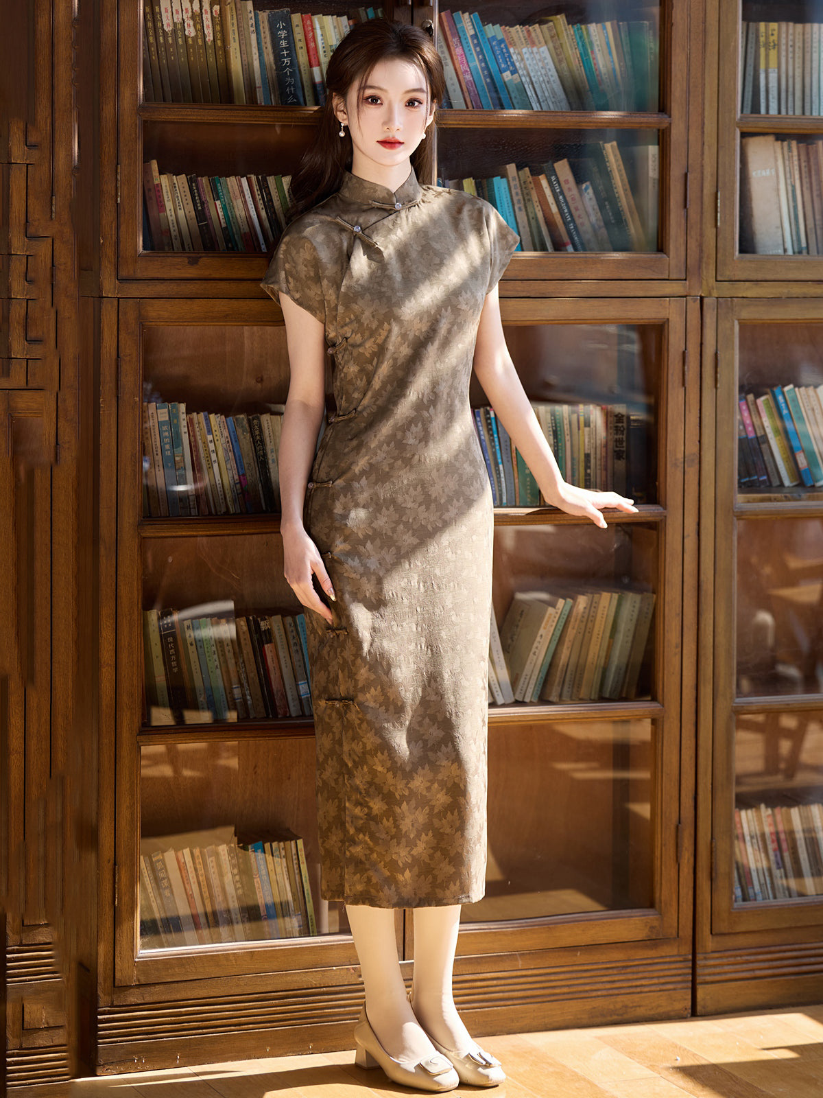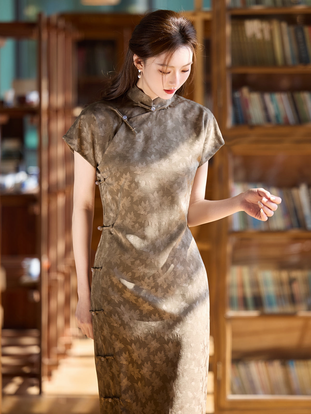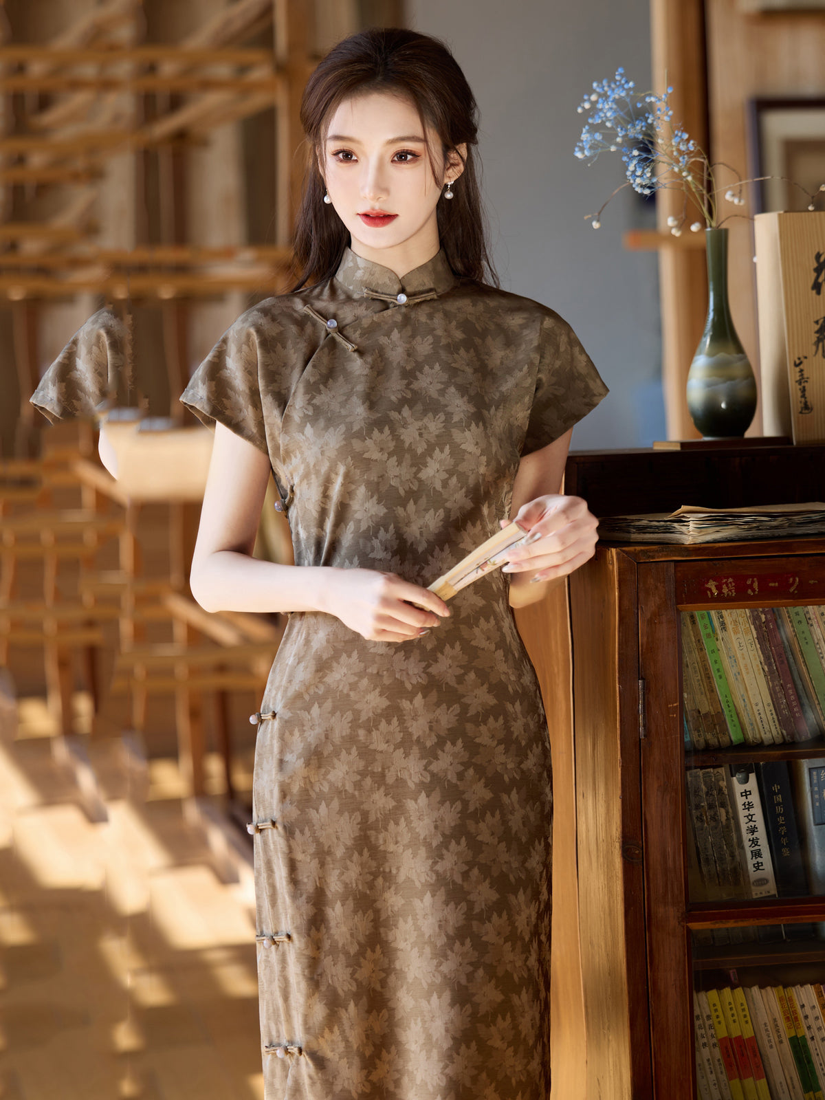 Mocha Maple Leaves 咖枫 - Short Sleeve Brown Midi Cheongsam