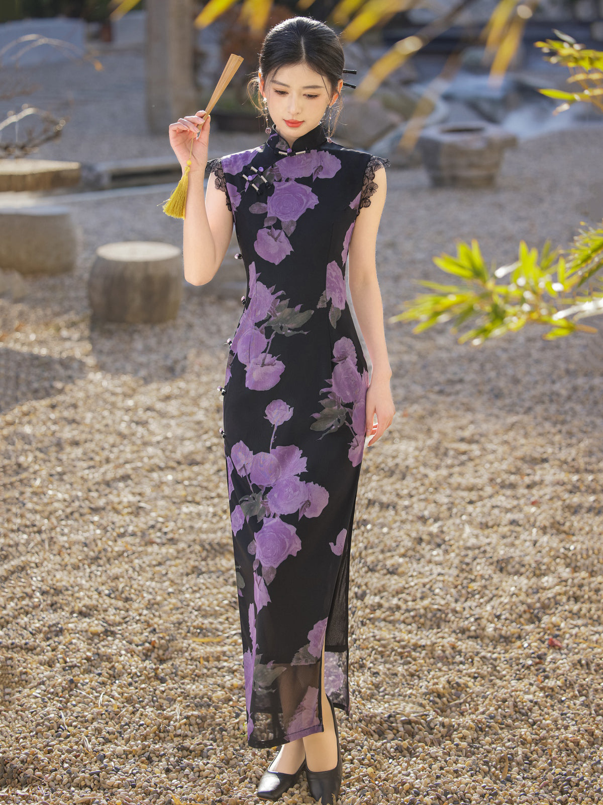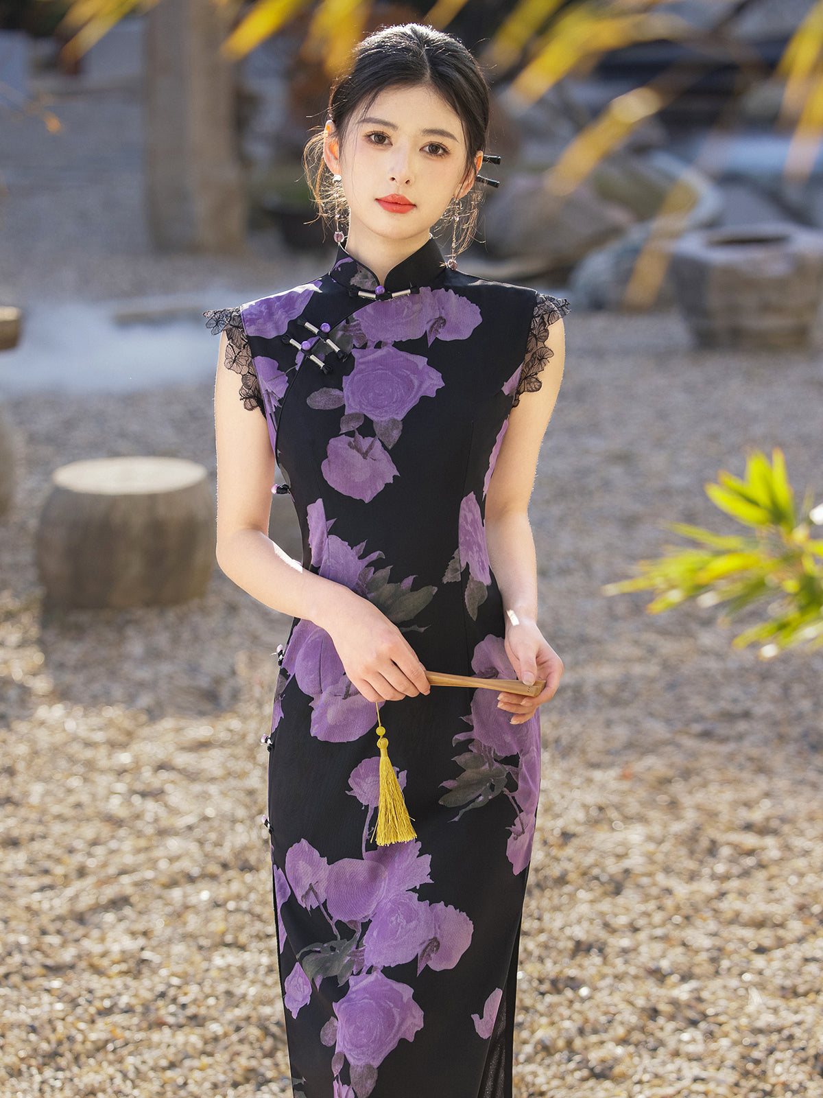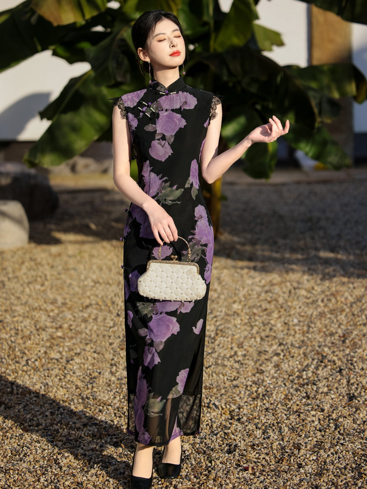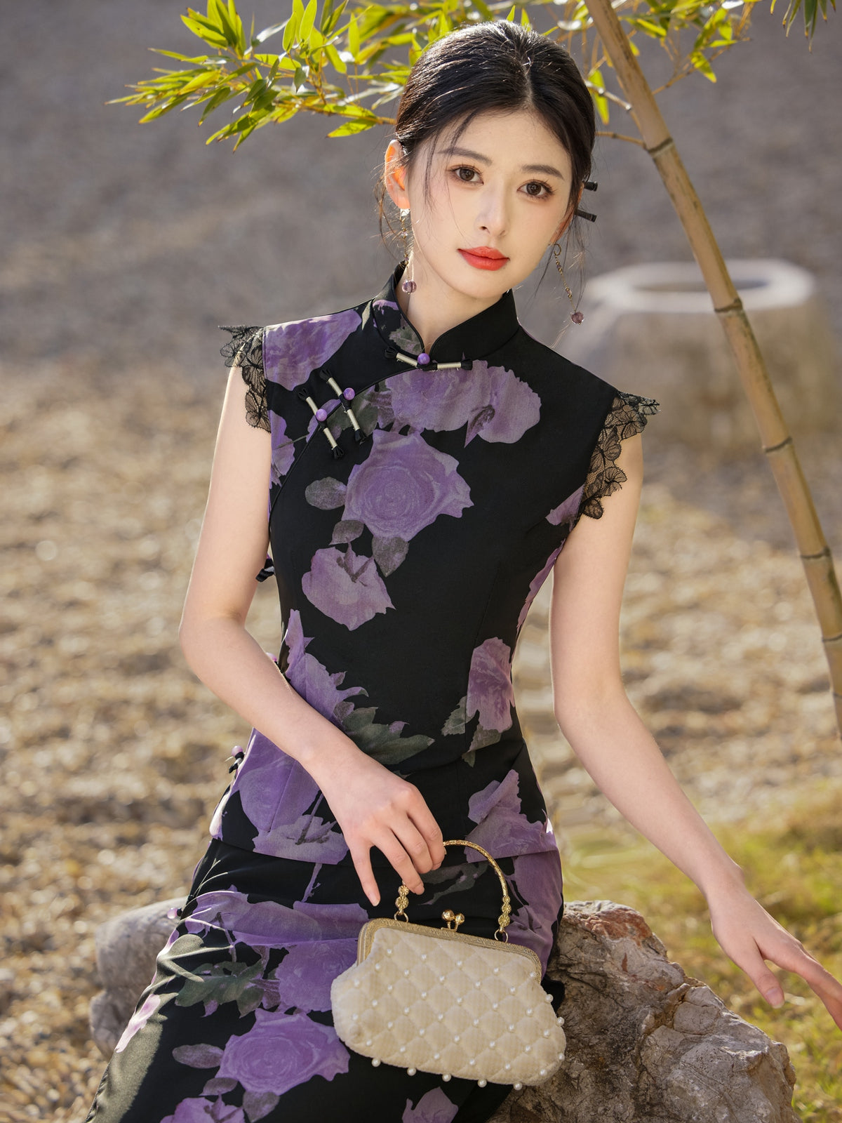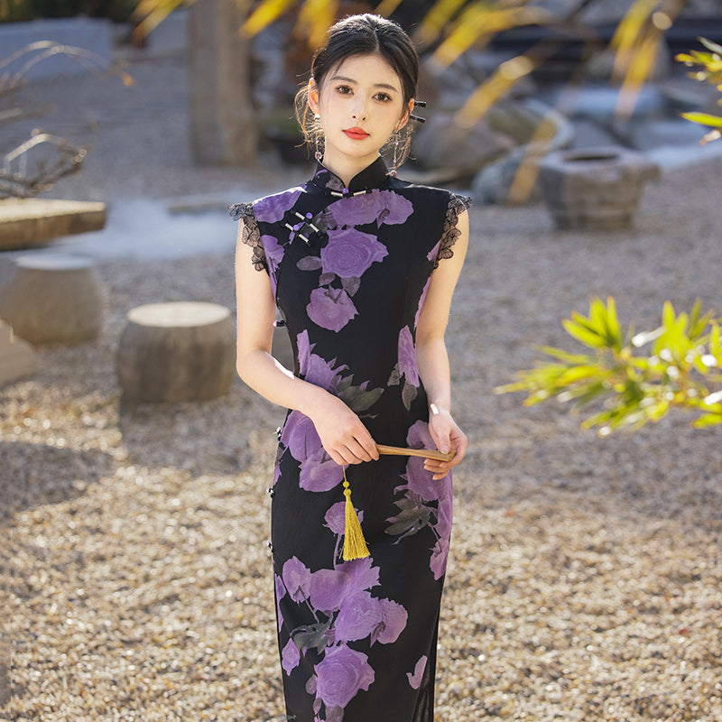 Mysterious Rose - Sleeveless Floral Purple Long Cheongsam