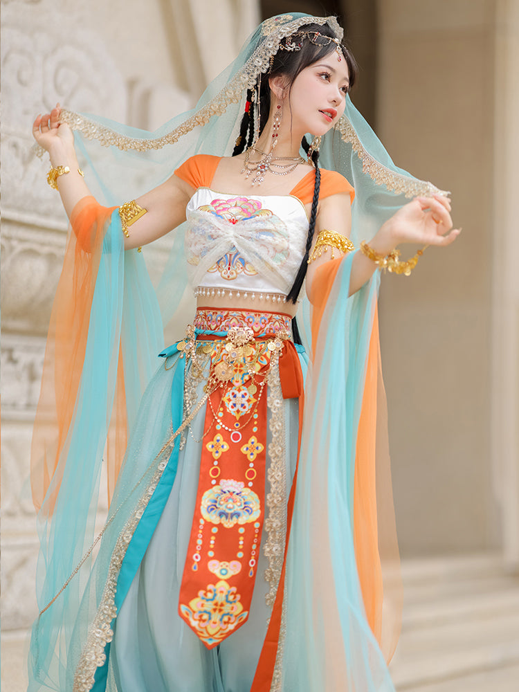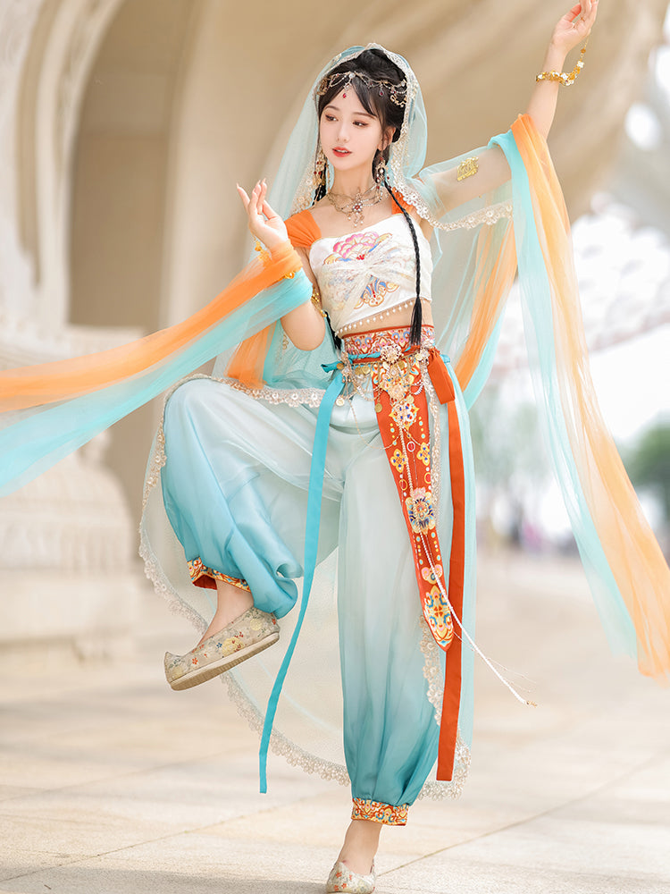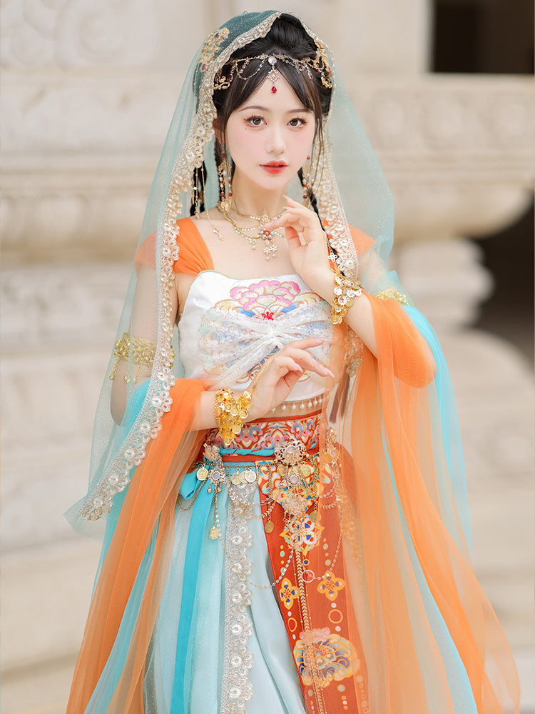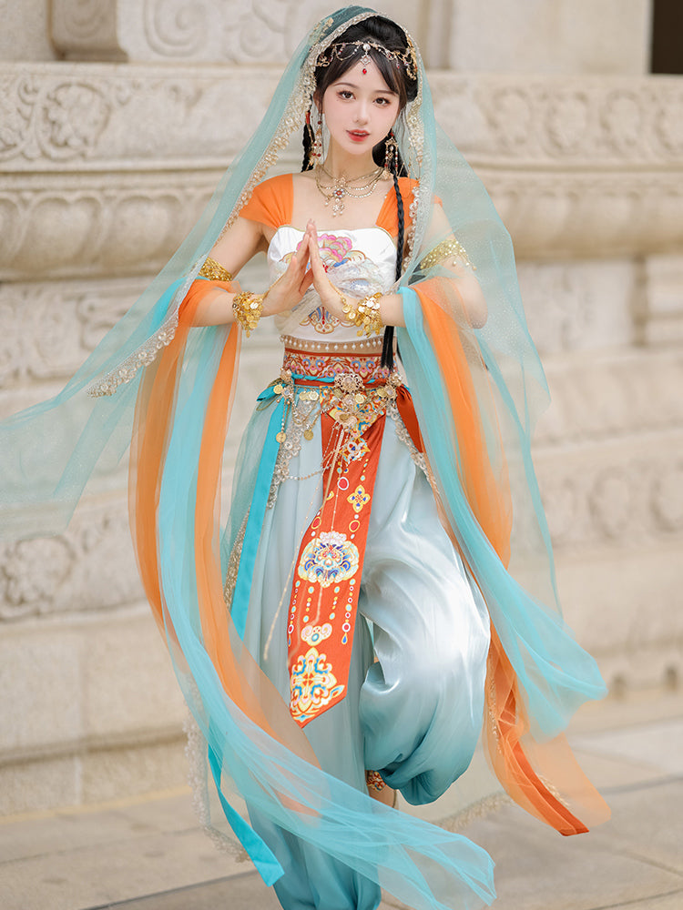 The Dunhuang costume is a traditional attire originating from the Dunhuang region in northwest China, along the historic Silk Road. This unique garment is a blend of Central Asian, Tibetan, Indian, and Chinese influences, highlighting the rich cultural interactions that took place in the area. Characterized by its vibrant colors, the costume embodies the region's artistic aesthetics and beliefs. Wearing this attire allows you to connect with the past, celebrate cultural diversity, and appreciate the timeless beauty that crosses both time and borders.