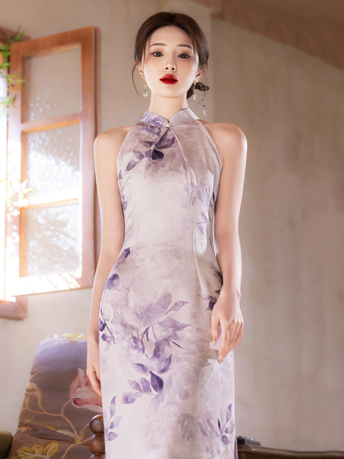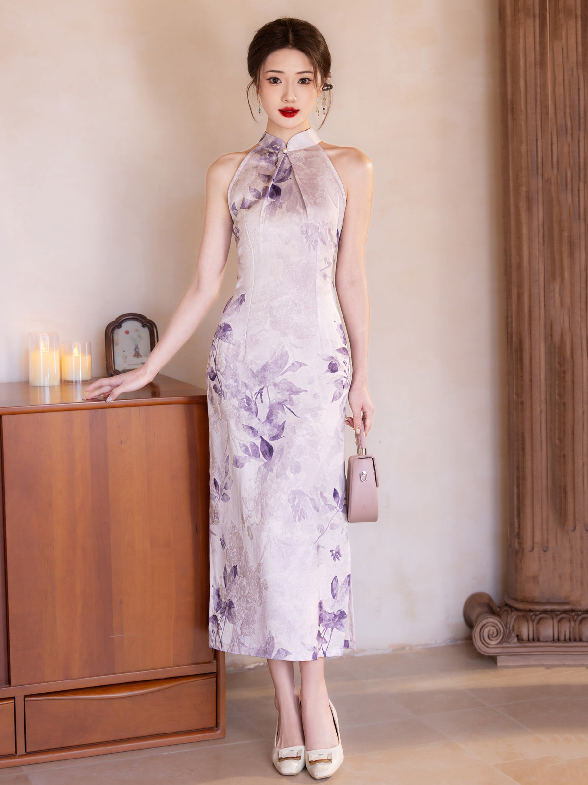 Purple Elegant Flowers 雅紫繁花 - Halter Neck Satin Long Cheongsam