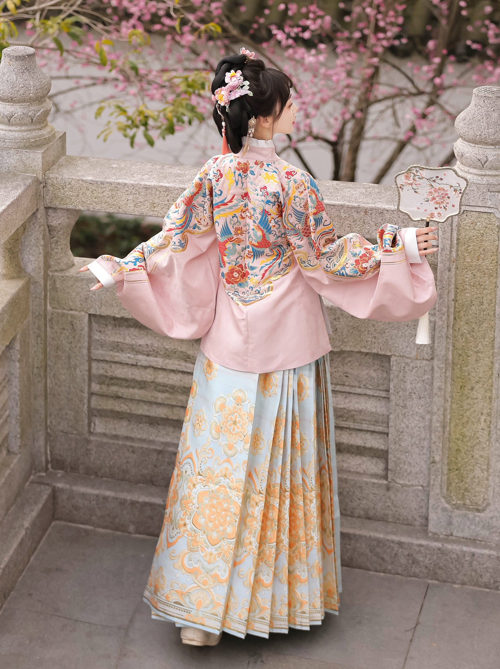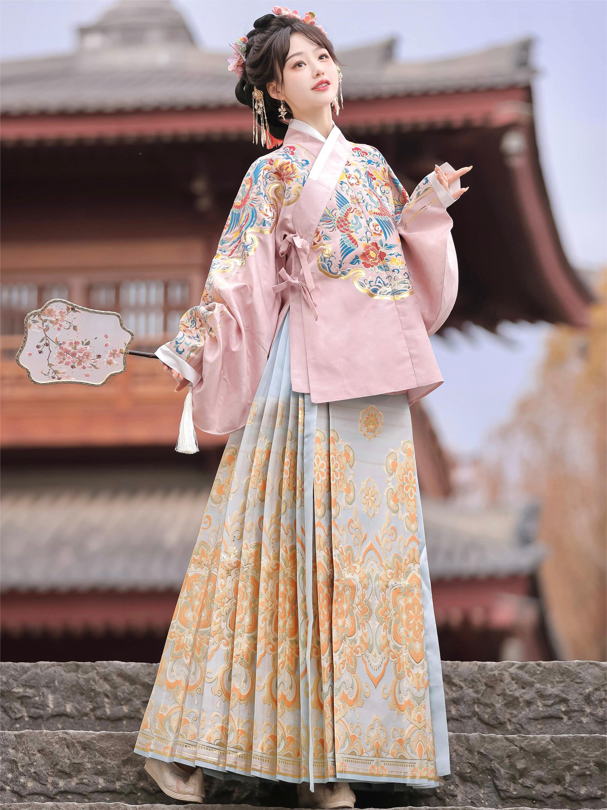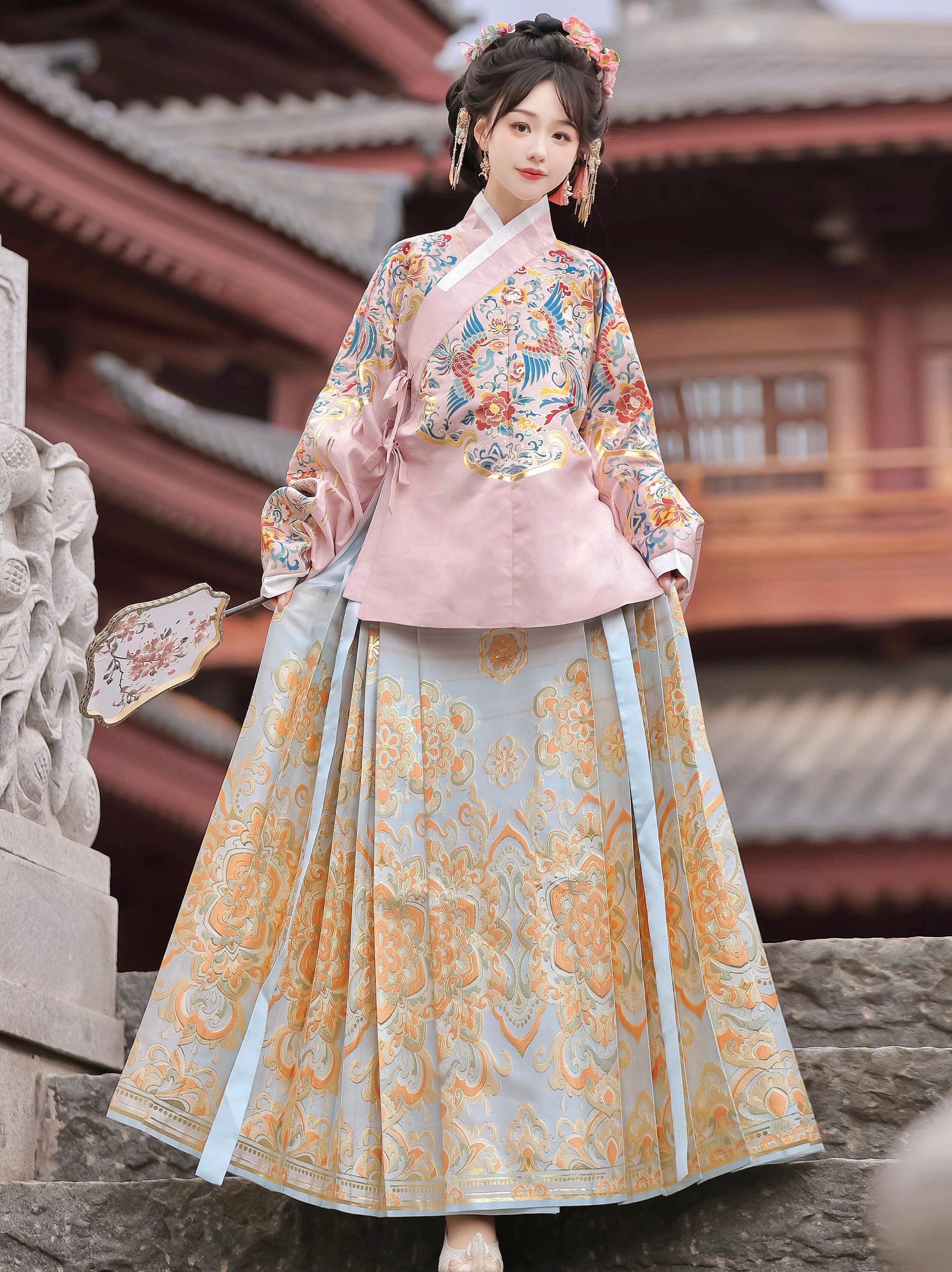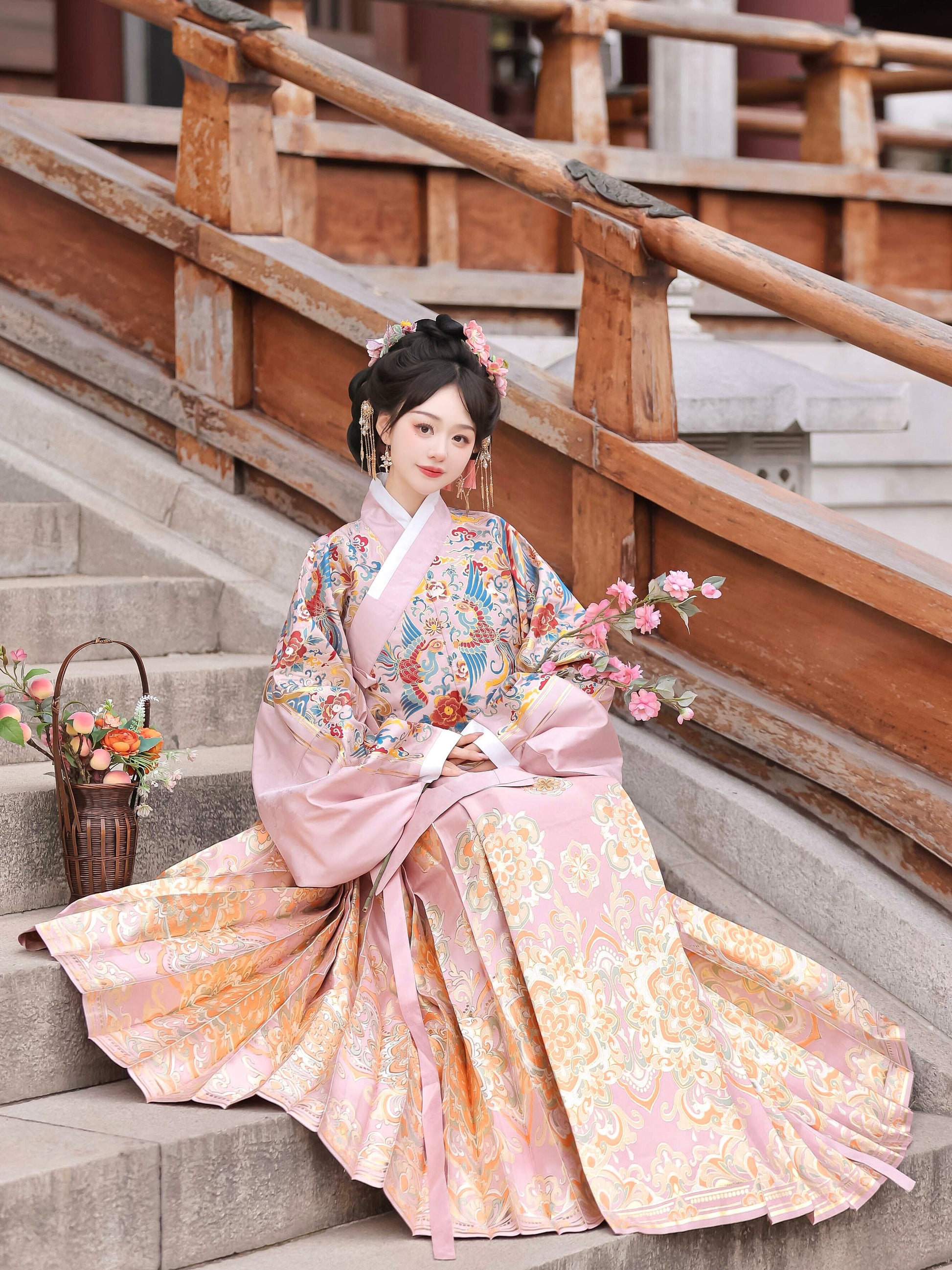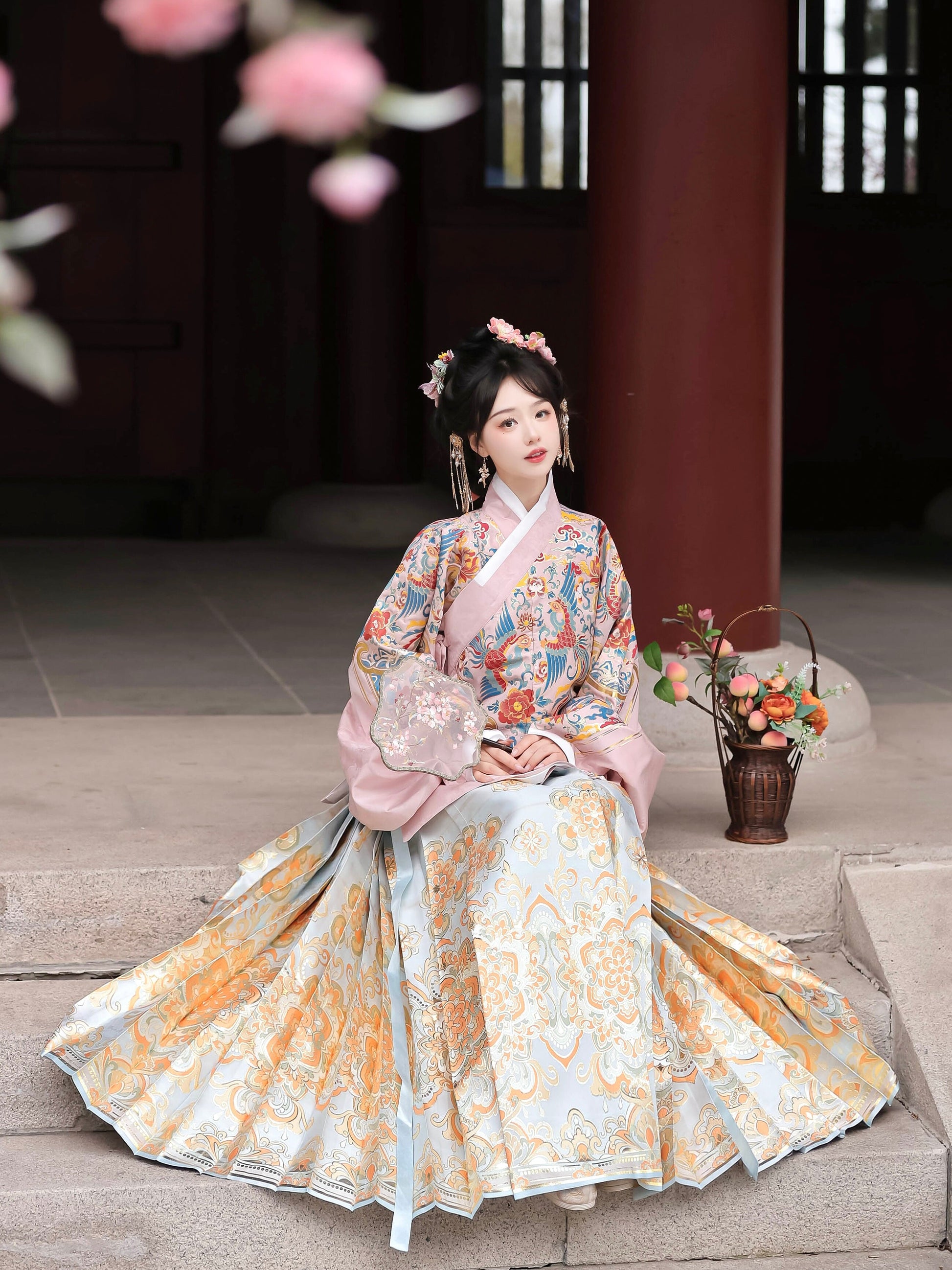 Shop Ming Dynasty women’s fashion, featuring structured Mamian skirts, embroidered cloud shoulders, and flowing robes. These historical Chinese garments are perfect for cultural events, festivals, performances, and even wedding or graduation ceremonies.
