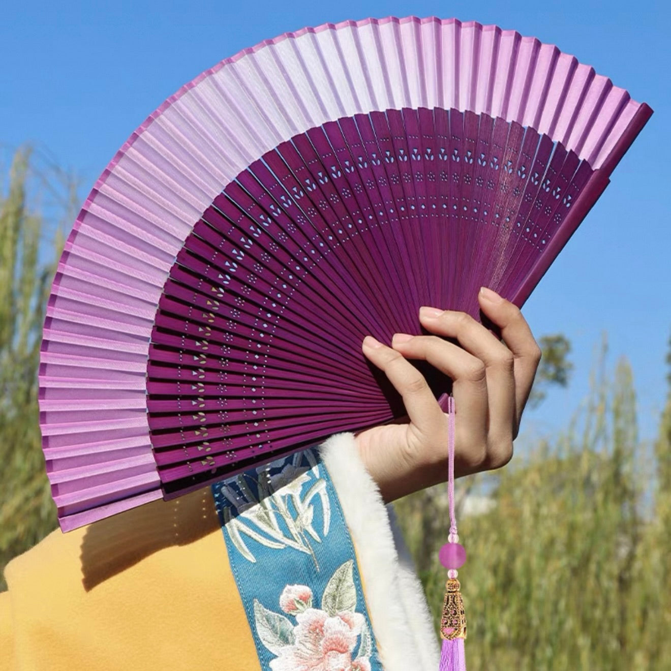 Pair your traditional Chinese Clothing, Hanfu, Qipao, or Cheongsam dresses with our folding fans. Inspired by Song Dynasty artistry, these hand fans are crafted from bamboo, some with embroidery reflecting the charm of East Asia. Perfect for cooling, gifting, or accessorizing.