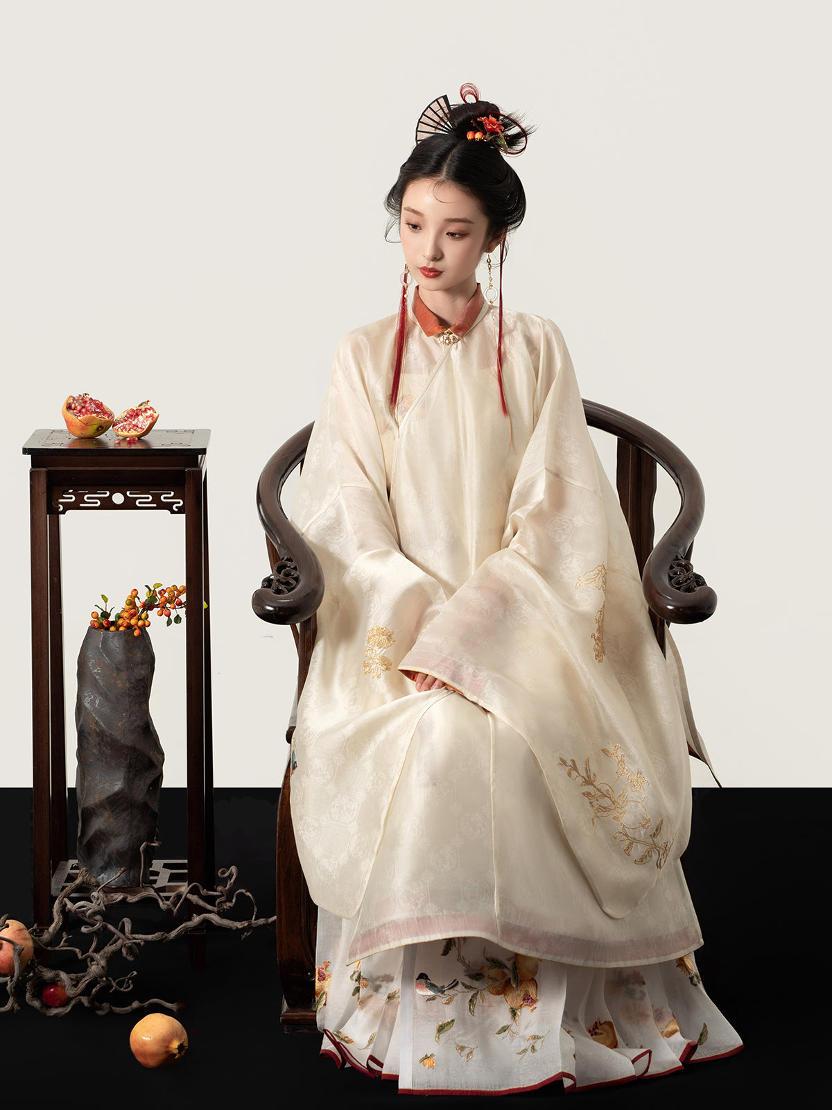 Shop Ming Dynasty women’s fashion, featuring structured Mamian skirts, embroidered cloud shoulders, and flowing robes. These historical Chinese garments are perfect for cultural events, festivals, performances, and even wedding or graduation ceremonies.