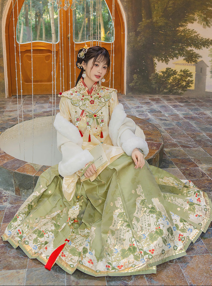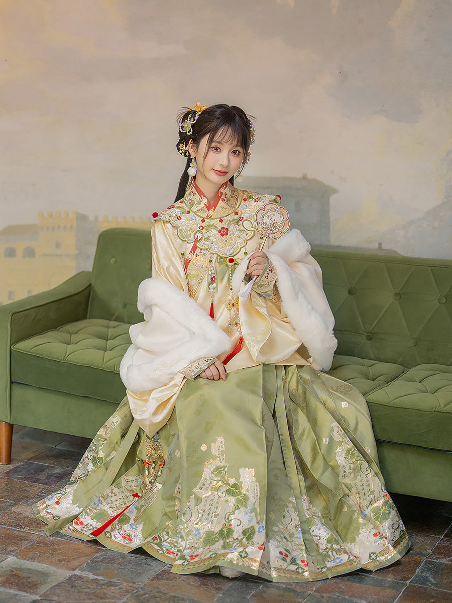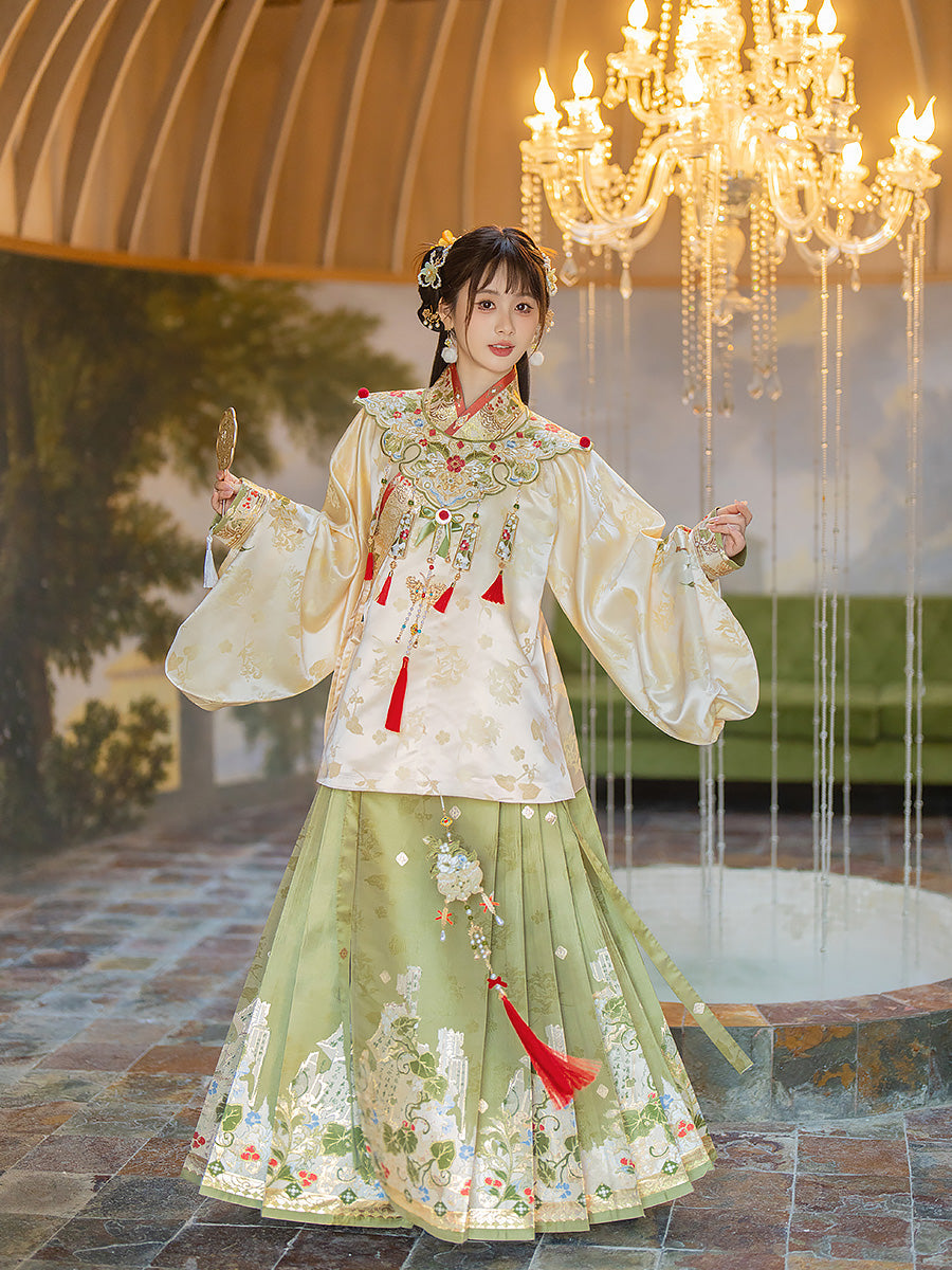 Shop Ming Dynasty women’s fashion, featuring structured Mamian skirts, embroidered cloud shoulders, and flowing robes. These historical Chinese garments are perfect for cultural events, festivals, performances, and even wedding or graduation ceremonies.
