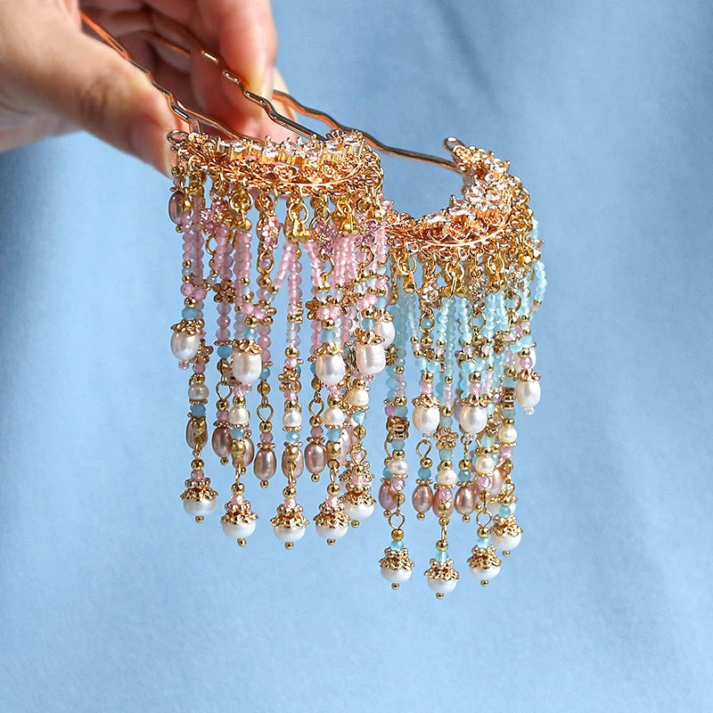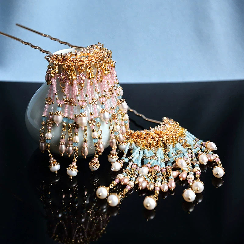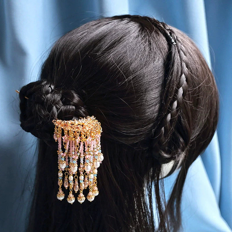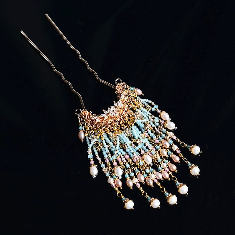 Hanfu hair accessories can vary widely in style, material, and design, but they all serve the purpose of enhancing the wearer's appearance and adding an extra touch of elegance to their hair. Some notable hair accessories commonly associated with Hanfu are hairpins (发簪, fāzān), hair combs (发篦, fābì), tassels (流苏, liúsū), hair ornaments (发髻, fājì), hairbands and headpieces (发饰, fāshì).
