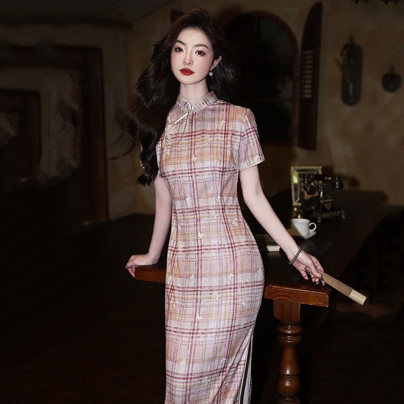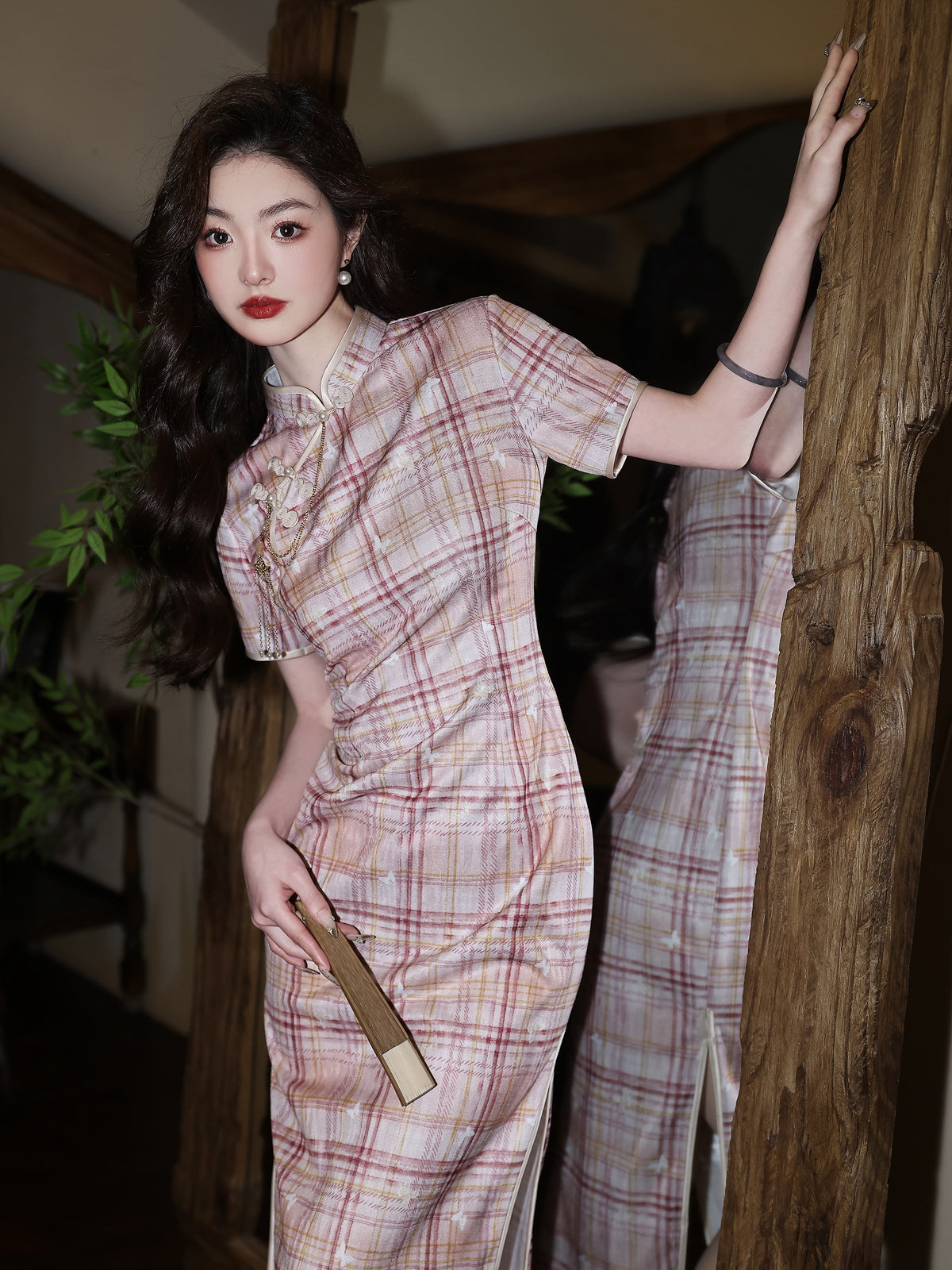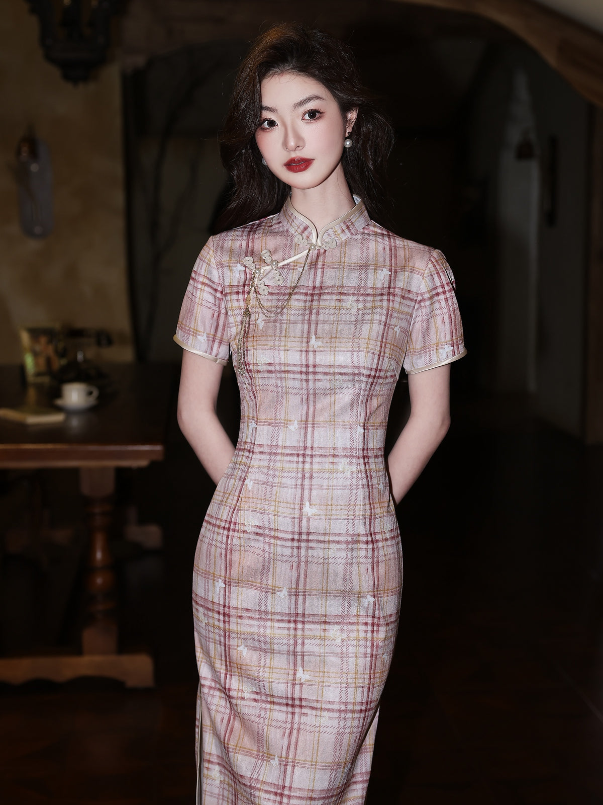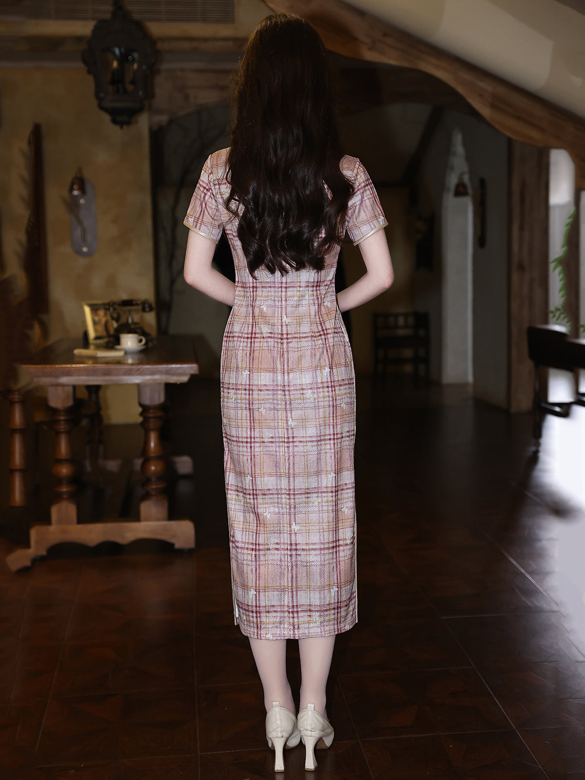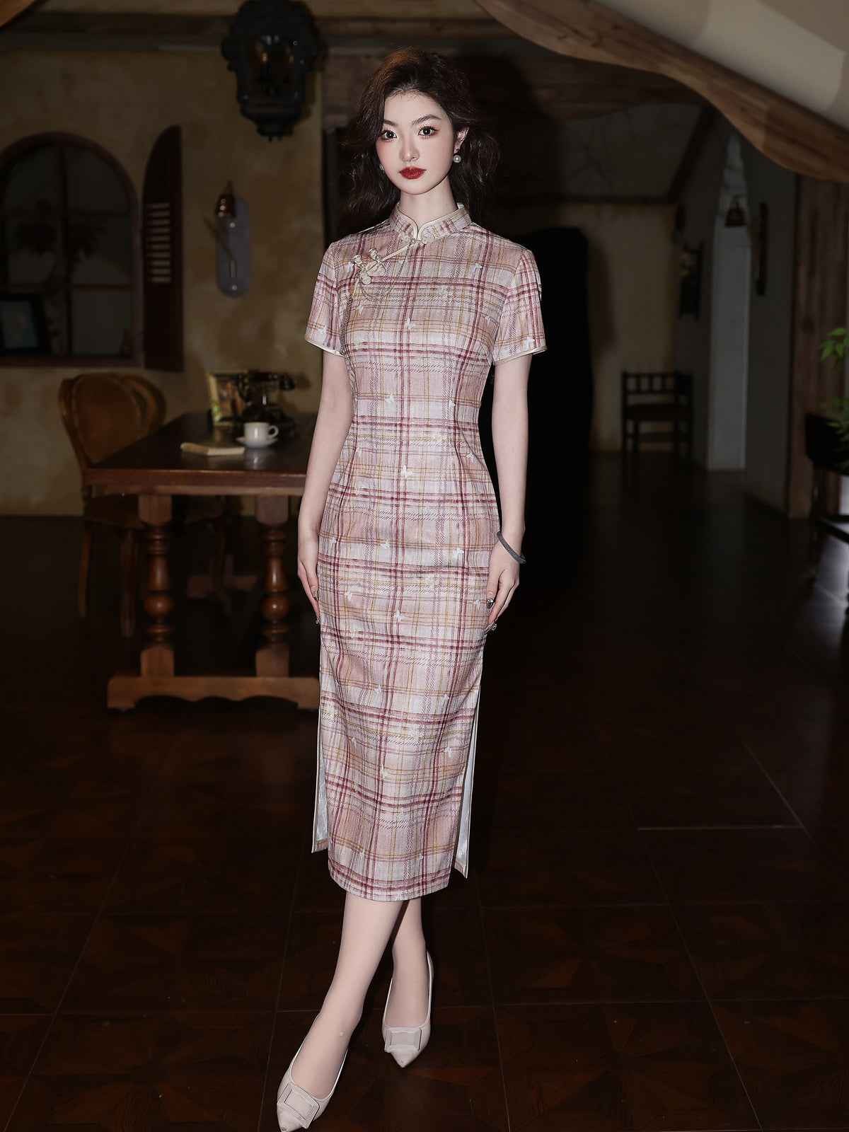 Warm Pink 暖粉 - Short Sleeve Plaid Cheongsam