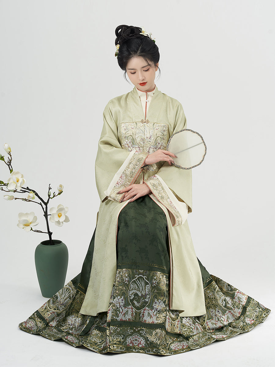 Shop Ming Dynasty women’s fashion, featuring structured Mamian skirts, embroidered cloud shoulders, and flowing robes. These historical Chinese garments are perfect for cultural events, festivals, performances, and even wedding or graduation ceremonies.