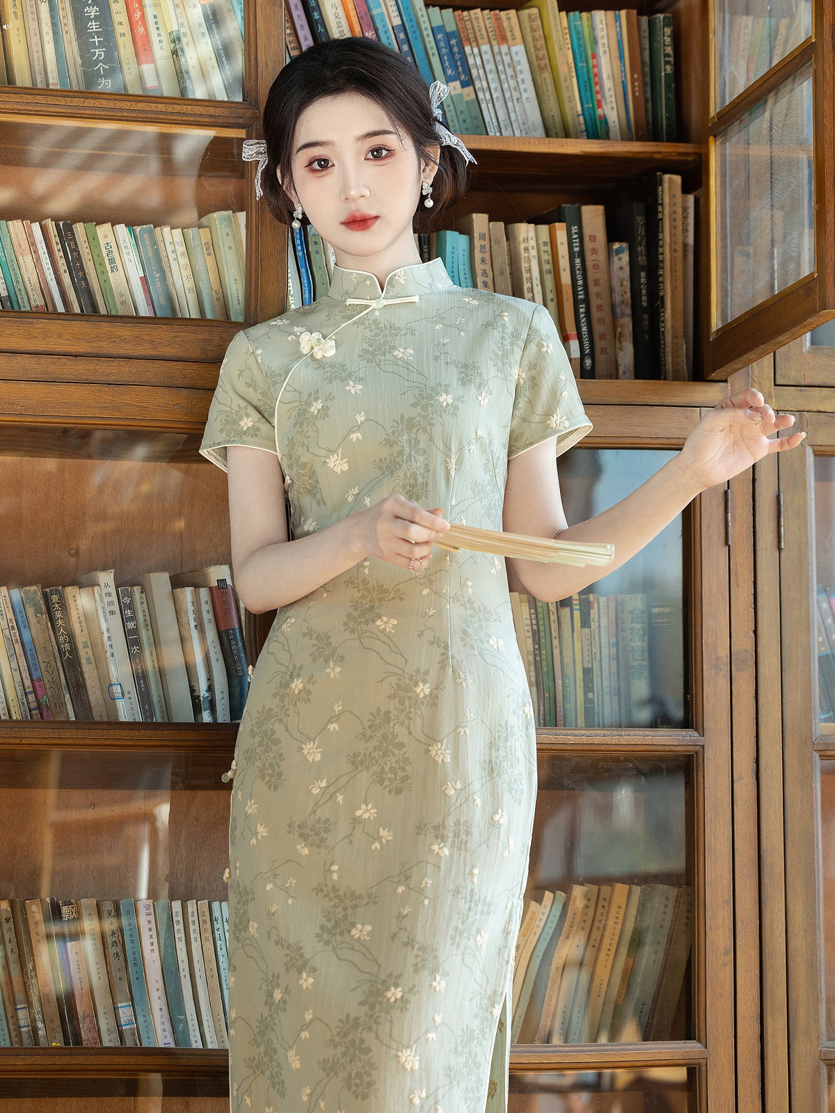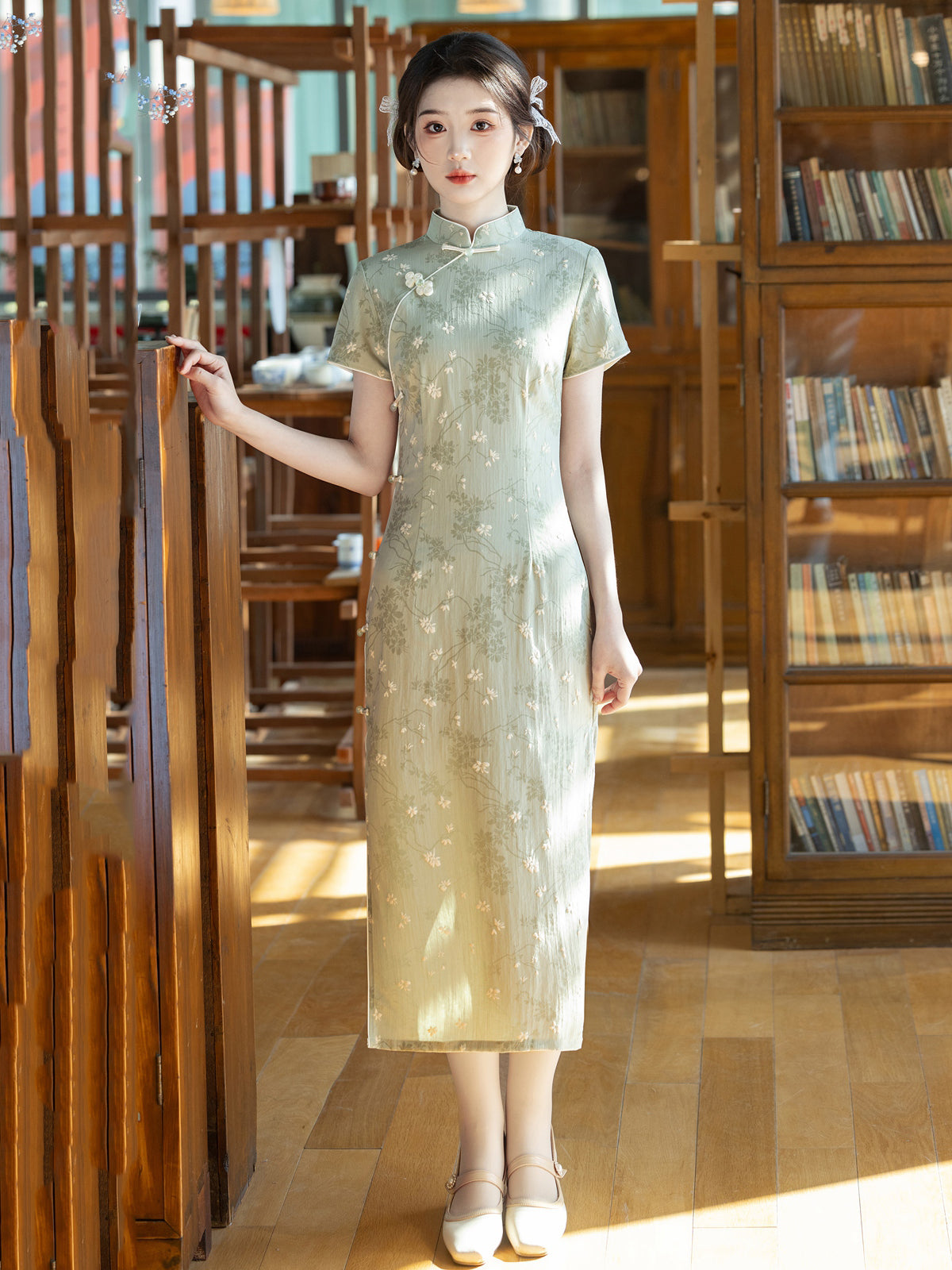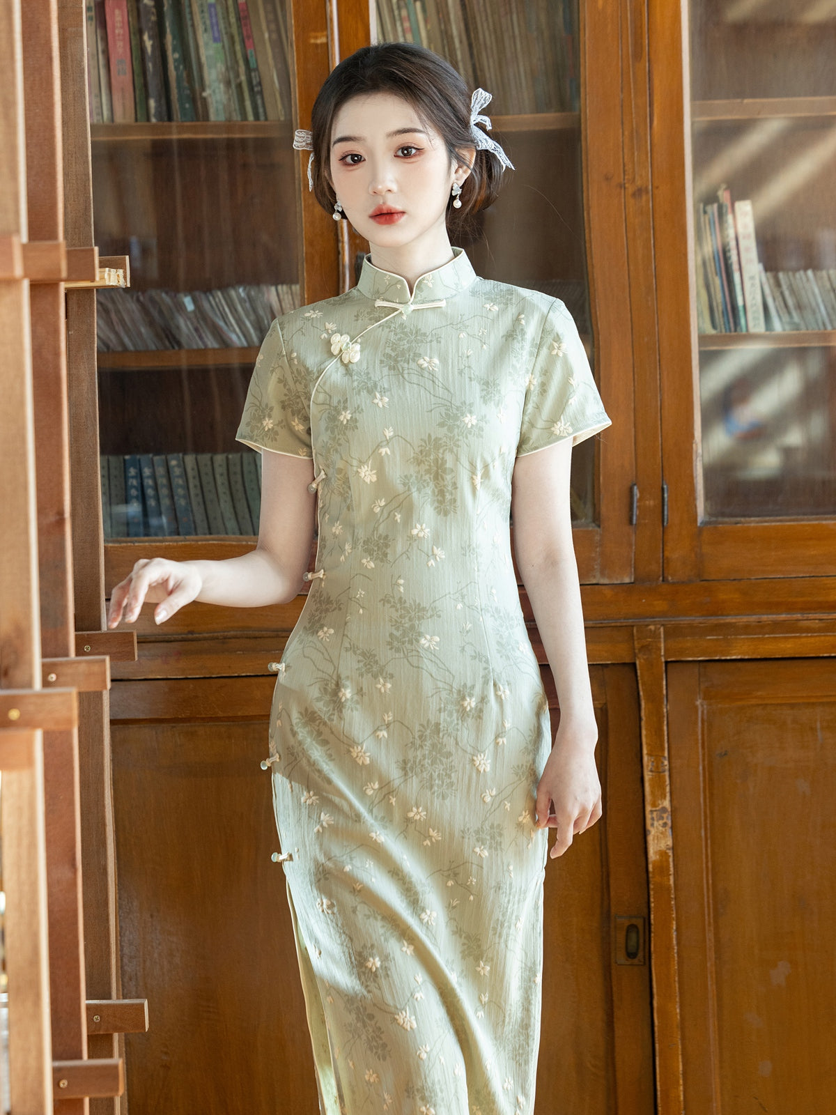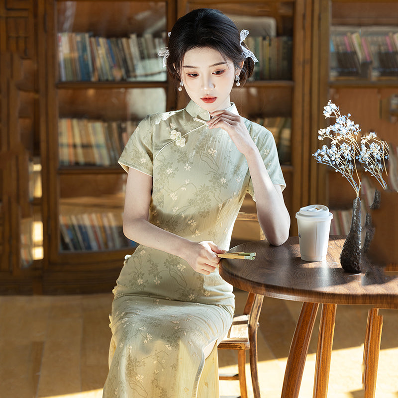 Windy Ferns - Short Sleeve Green Floral Midi Cheongsam